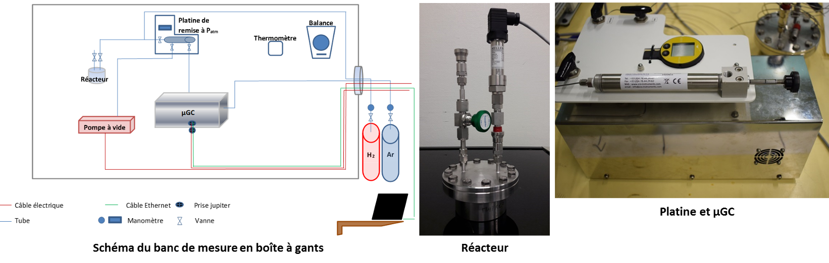 Principe de la mesure :La mesure consiste à confiner l'échantillon de déchets dans un récipient hermétique (réacteur) et à réaliser des prélèvements à intervalles de temps définis. La concentration en hydrogène du gaz prélevé dans le réacteur est mesurée par micro-chromatographie gaz (µGC) et convertie en mol/g de déchet. Principaux éléments du banc de mesure :- Réacteur étanche contenant l'échantillon à mesurer, équipé d'un capteur de pression, - Pompe à vide, - Platine de prélèvement/compression permettant de réaliser les prélèvements de gaz dans le réacteur et de comprimer le gaz prélevé avant analyse, - µGC pour la mesure de l'hydrogène, - Bouteilles de gaz (étalons, vecteur), - Thermomètre, - Balance. |